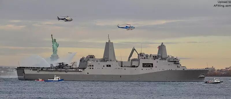 全通甲板的“美国”号比传统两栖战舰(如图中的“纽约”号)具有更强的搭载直升机的能力