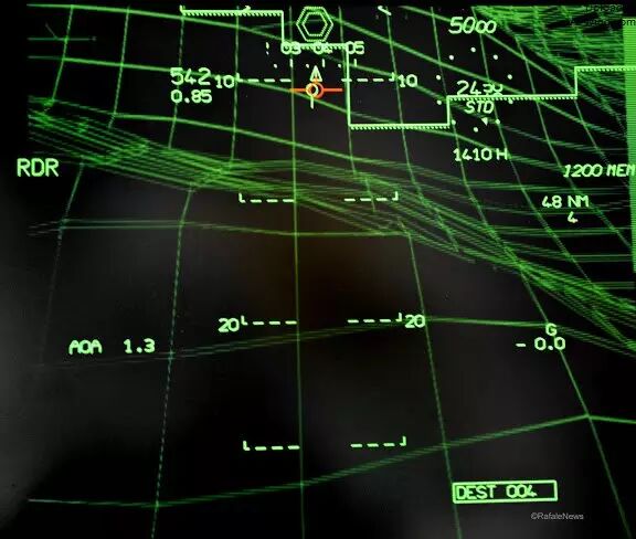 我们和“幻影”2000开始尾追评估,我首先在55公里开外用RBE2锁定了“幻影”2000,然后用前扇区光电套件的电视摄像机进行目视识别,电视视频呈现在右侧下视显示器上。