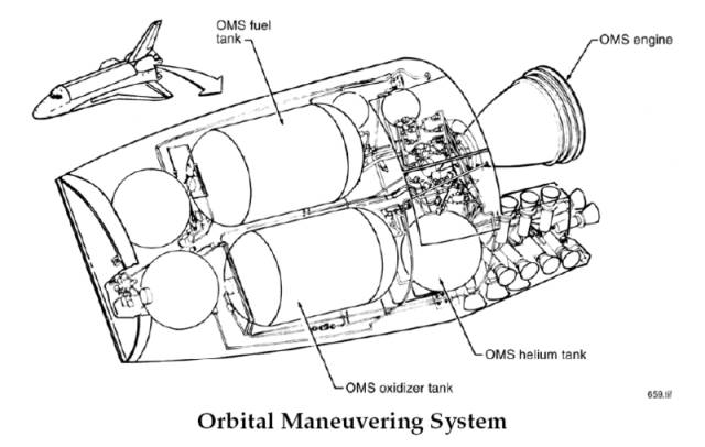 SSME发动机燃烧液氢和液氧,每台最大推力2090千牛(213吨),是“土星”V运载火箭J-2型发动机推力的两倍多。SSME发动机只负责把轨道器推出大气层,一旦进入太空后轨道器就切换到轨道机动系统(OMS)推进,后者是麦道公司制造的两台火箭发动机,安装在垂尾两侧。轨道器没有配备喷气发动机,滑翔返回地球并降落在跑道上。这种方式已经在升力体上进行了验证,并且在以后实际操作中也被证明是成功的。