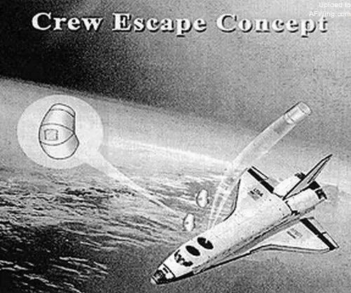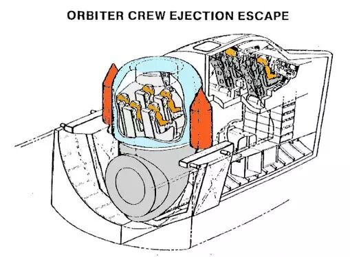航天飞机原计划安装的弹射救生系统,正副飞行员有单独的弹射座椅,其他乘员则依靠弹射救生舱逃生