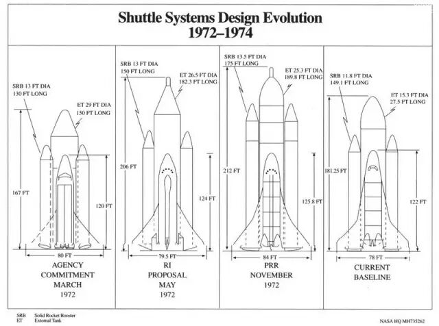 航天飞机设计在1972-1974年间的演进,NASA已经抛弃了可飞回助推器设计