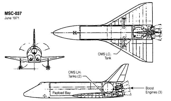 NASA载人航天(OMSF)办公室主任,乔治•米勒在1969年4月已经组建了一支“航天飞机任务小组”,该小组提出的A阶段航天飞机计划正是按照这种思路设计的,由可回收助推器级和轨道器级组成,安装了火箭和喷气式发动机的两级都能可重复使用。火箭发动机将使用液氧和液氢(LOX-LH2)推进剂。轨道器的后货舱可以装多达11350千克货物,前载人舱可容纳两名机组和12名乘客。