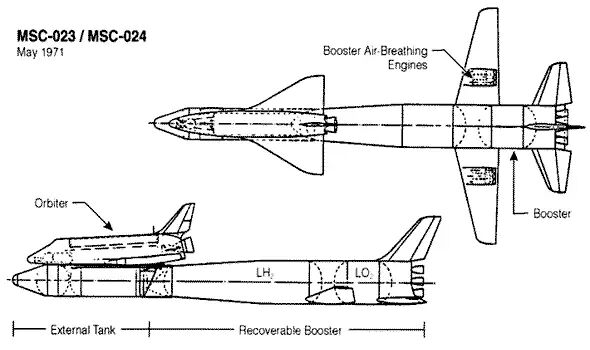 A阶段航天飞机更像是一个通用概念而不是具体方案要求。1970年年初,NASA提出了一个更具体的B阶段方案要求,一开始设想了一种有翼可飞回助推器和轨道器。大型可飞回助推器的尺寸相当于一架大型喷气式客机,背负着较小的轨道器。B阶段航天飞机会有很强的性能,但也将非常昂贵。尼克松政府对太空计划并没有太大热情,一直在削减NASA的预算,航天飞机计划看起来有点像强买强卖。
