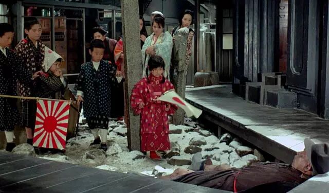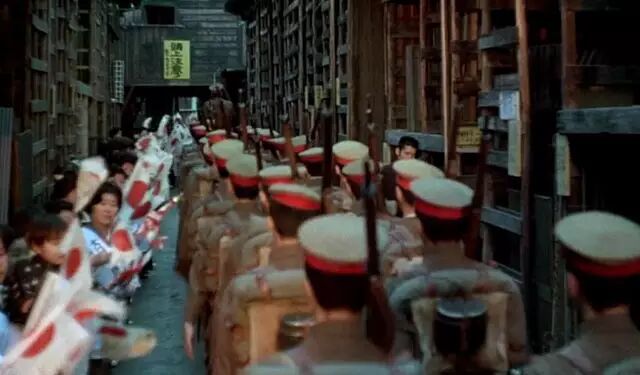 片中的一个段落的场面调度是,吉藏一心着急回去见阿部定,在街上与兵变军士的游行队伍擦肩而过,耀眼的日光罩着行进的军队,呈现出一种血色殷殷的恐怖感,与画左街道上群众手中挥舞的白底红心的太阳旗正好构成视觉上的强烈呼应;吉藏一人低头逆行于画右,屋檐的光影和民居的绿漆栏杆将他紧紧压闭于暗绿色阴影之中,其移动方向和色彩都显得与军队极不协调。