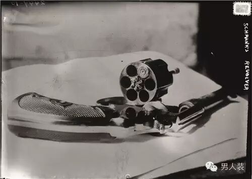 施兰克是在纽约买的这把枪,跟随着罗斯福的竞选步伐穿越了八个州,可谓意志坚定……终于,晚上8 点之后在格力帕特里克酒店,他逮到了机会。这颗0.38 口径的子弹击中了罗斯福的胸部,穿过了他的钢制眼镜盒和讲稿,虽然耗尽了大部分能量,子弹在射入罗斯福胸腔后仍然击断了他的一根肋骨。