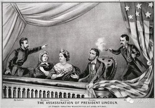 笑声掩盖住枪声,却并没有掩盖住总统夫人玛丽· 林肯的尖叫声(我敢打赌,这要换个男人绝对不可能尖叫超过女人),陆军少校亨利· 拉斯伯恩发现情况后迅速跃起扑向布思,布思早有准备,立马掏出一把匕首割伤了拉斯伯恩的前臂,就在拉斯伯恩伸手掏枪的时候,布思再次挥动匕首猛砍他的胸部,随后攀着总统包厢的前沿从4 米高处跳到了舞台上。尽管落地时摔断了一条腿,他还是骑马逃走了。林肯熬过受到枪击的那一夜,却在次日清晨死去。10 天之后,在与联盟部队的对峙中,布思自己也被击中后脑而亡,而林肯早在9 天之前死在了剧院附近的彼得森公寓中。布思的余党后来也被一个个抓到并被处死。
