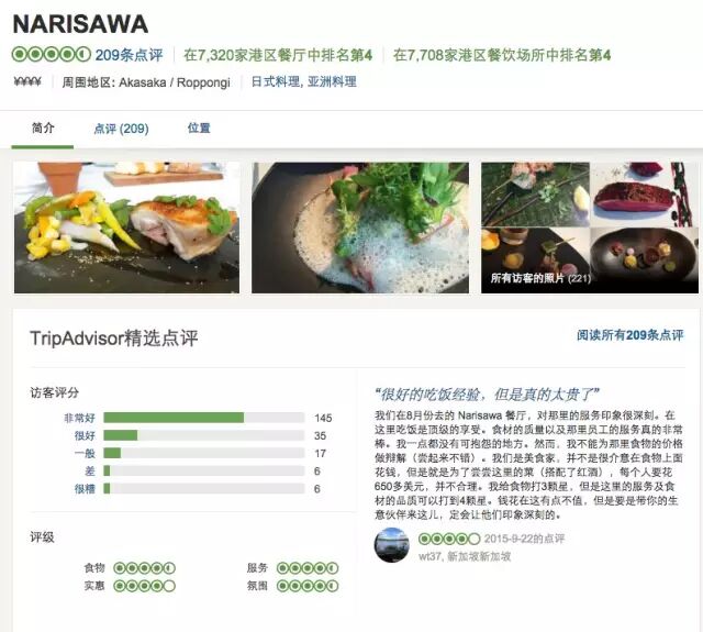 东京三星Narisawa,首页用户点评为翻译稿(Dinning Experience被翻译成了吃饭经验,难道不应该是用餐体验么?),而且还是个中评……不过Narisawa的公关大概也不在乎吧?