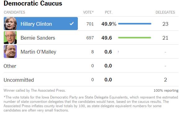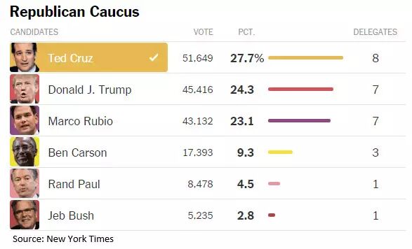 ▍ 爱荷华初选 首场初选的结果其实并不是几个数字那么简单。 从共和党方面看,来自德州的参议员泰德·克鲁兹得票最多(27.6%),纽约地产商川普次之(24.3%),第三名是来自佛罗里达的参议员马可·卢比奥(23.1%),而小布什只获得2.8% 的选票,前景堪忧。民主党方面,希拉里(49.9%)与伯尼·桑德斯(49.6%)差距甚微,希拉里以极其微弱的优势领先。