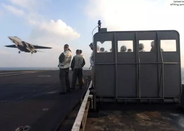 大部分FCLP在夜间进行,飞行员在四转弯后只有很短的调整时间,把“肉丸”保持在基准线之间并维持住正确速度。这种练习是真正的精确仪表飞行,后座RIO负责监视各参数并在必要时报给飞行员。在夜间,只有模拟甲板区域才会亮灯,即增加了真实感,也没有其他景物能让飞行员分心。作为一名“海鹞”飞行员,我已经习惯了在机轮触地时猛地关闭油门(垂直着舰),而现在,我必须驾驶“雄猫”直冲向甲板,而且不能减速。