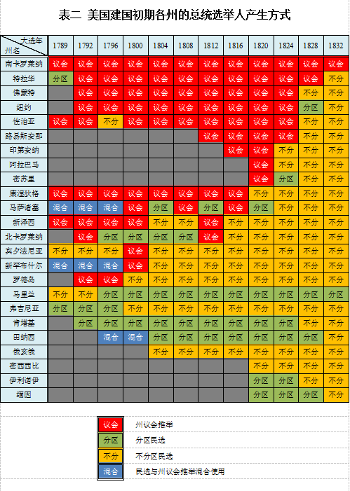 与此同时,这个时代更大的变动正在悄悄到来。十九世纪二十年代,美国社会争取普选权(或者严格地说,成年白人男性普选权)的运动节节胜利,各州先后取消了对投票资格的财产限制,令选民人口成规模地增加——1828年总统选举的投票人数几乎达到1824年的三倍。除此之外,人民主权理论的深入人心也导致了总统大选中“选举人”产生方式的变化。刚建国时,大多数州是由州议会来推举本州的选举人,因此政党并无动员选民参与总统大选的必要。到1824年时,全国尚有四分之一数量的州是通过这种办法来决定选举人;然而到了1828年时,除了特拉华与南卡两个州外,其它各州均已改由民选方式产生选举人(参见表二)。