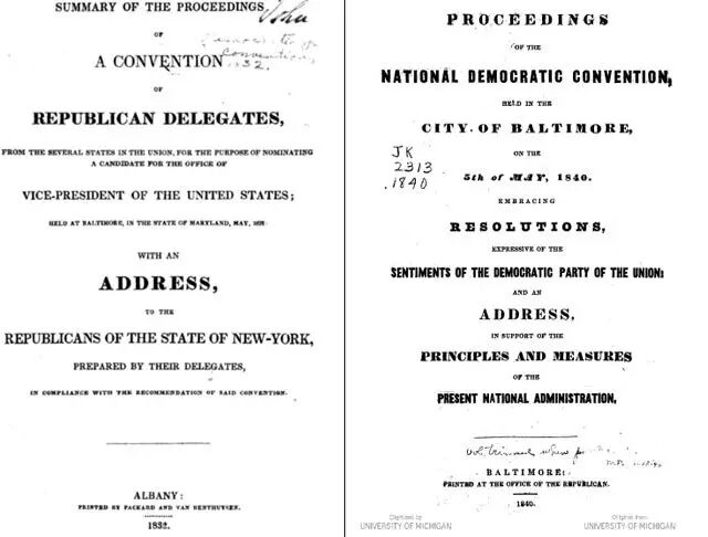 ▲ 图二 杰克逊民主党1832年(左)与1840年(右)全国代表大会会议记录封面对比