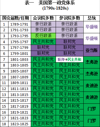 1800年大选,杰弗逊击败亚当斯,实现了和平的政党轮替;四年后,联邦党事实上的领袖汉密尔顿在决斗中身亡,联邦党群龙无首,从此无力回天。杰弗逊共和党连续二十多年把持国家立法与行政大权(参见表一);联邦党在各州的地盘也不断遭到蚕食,影响力逐渐收缩到新英格兰一隅。