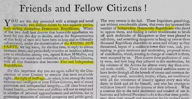 注:其时联邦党已在费城失势,当地共和党一党独大后分裂为几派,均自称“民主共和党”;其中发放该传单的一派又先后被称为“日升党(Rising Sun Party,“日升”是费城当时的一个小酒馆)”、“第三派家伙(Tertium Quids,或简称Quids即‘家伙’)”、“宪政共和党(Constitutional Republicans)”等等。