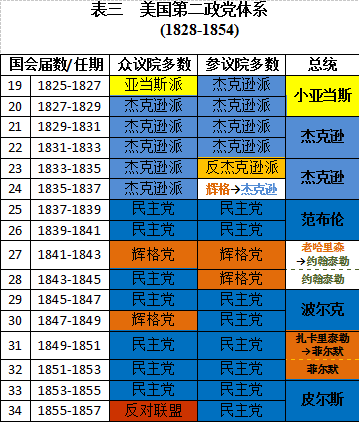 在当时的政治人物中,杰克逊派的范布伦(Martin Van Buren)最敏锐地捕捉到了这些信号。在他的统筹下,杰克逊派深耕各州基层,发展出了诸如“阿尔巴尼摄政团(Albany Regency)”等长期操纵地方政局的政党机器。1826年中期选举与1828年大选,杰克逊派均大获全胜,并在此后的第二政党体系(Second Party System)中长期占据优势地位(参见表三)。小亚当斯丢掉总统宝座后,克莱扛起了“反杰克逊派(Anti-Jacksonians)”的大旗,并一度将其改组为“国家共和党(National Republicans)”,从而把杰弗逊共和党的衣钵拱手让给了杰克逊派。
