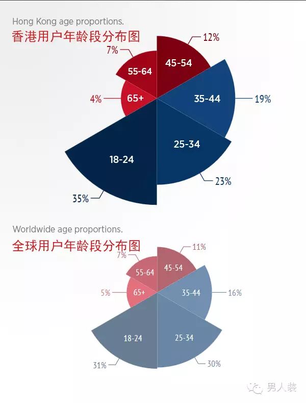 在香港,为网站贡献流量的多为千禧一代,其所占比例高达总用户数的58%。香港人比较长寿,84岁的老人一抓一大把,而55岁以上的人约占当地人口的30%,在全球,这个比例仅有15%。但奇怪的是,香港55岁以上的用户却只占当地用户的11%,比同龄人在全球用户中所占比例还低1%。