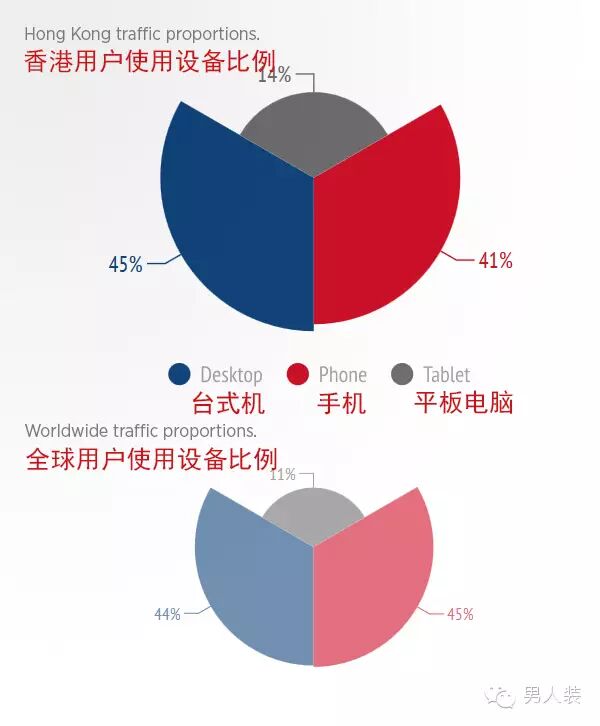 香港人很喜欢用手机浏览。虽说上图中,香港用户使用手机的比例低于全球用户,但他们又用平板电脑14%的比例扳回一局。