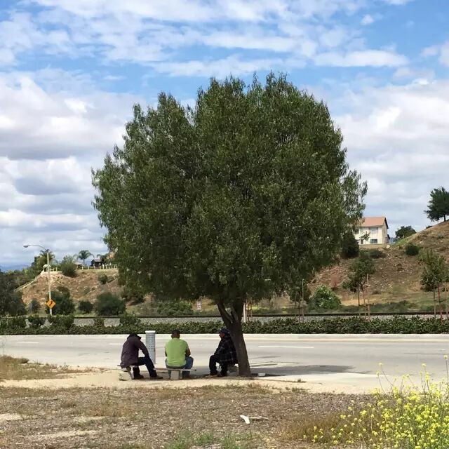2016年4月,加州。摄影师是张辛欣的朋友姚晨。“辛欣让我为她的文章配照片,我就问长居此地的同事Sue当地的黑工都在哪里集体露脸等待挑选。她给了地点,我中午驾车过去,果然看见有三位男子坐在路边的树荫下。因工头一般是一早挑好人,这三位应该是被捡剩下的,边聊天,边守株待兔。因为他们对外人比较警觉,我只能假装是在拍他们身后干涸的河床,乘他们不注意偷拍了这张。”