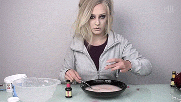 第二步:依次向盘子或碗中倒入白明胶、面粉和食用色素,记得分3次搅拌。