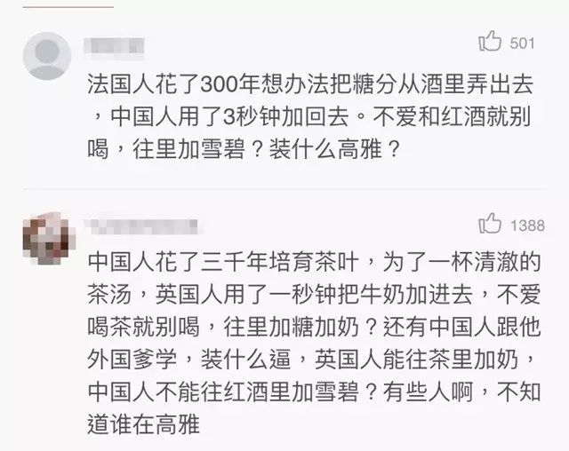 “中国人花了三千年培育茶叶,为了一杯清澈的茶汤,英国人用了一秒钟把牛奶加进去,不爱喝就别喝,往里加糖加奶?还有中国跟他外国爹学,装什么逼,英国人能往茶里加奶,中国人不能往红酒里加雪碧?有些人啊,不知道谁在高雅”。