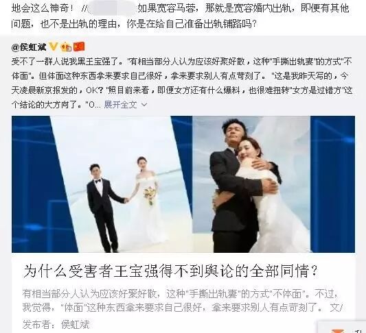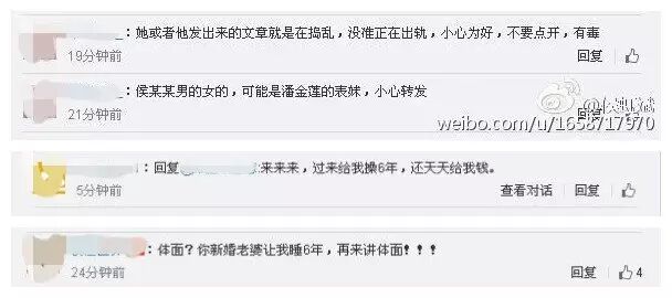 我把这一段作为提要,提到前面了,后来,头条微博也推广了我这篇长文。结果,你猜怎么样?有一半以上的评论说我不体谅宝宝(王宝强),说我没资格批评宝宝,说我不要脸,说我是碧池、是马婊、用极其下流的话来侮辱我(认为我是女的),说让你老婆也出轨一下你就满意了(以为我是男的)。