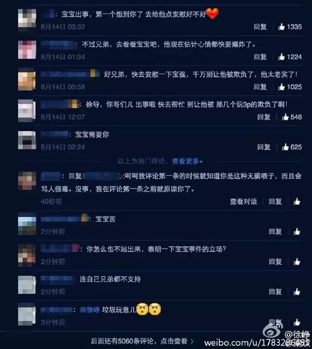 一类,是明星,只要跟王宝强关系好的明星没有第一时间站出来表态,就骂,如,“徐铮,垃圾玩意儿”“兄弟也不支持?”,或者是抒发自己的人生感慨被认为影射的,如袁立、蔡少芬,就骂她们是妓女,骂的话直奔下三路;