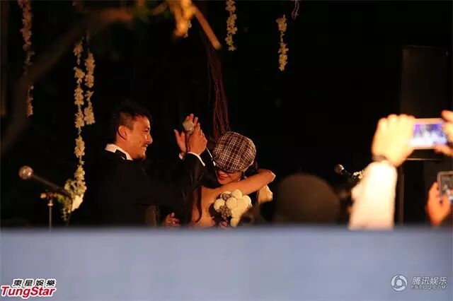 张震婚礼上,接到新娘捧花的舒淇与新娘庄雯如拥抱