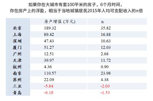 中金公司研究部整理多方数据发现:假设在北京西城区有一套100平米的房子,从今年2月到8月,这套房子增值189.32万元,增幅达26.69%。按照2015年北京市城镇居民人均可支配收入为52859元,一个普通北京城镇居民工作36年,才刚刚超过这套房子在今年6个月的涨幅。在上海、深圳、厦门和天津, 当地普通城镇居民则分别需要16年、10年、12年和11年。(中金金网公众号)