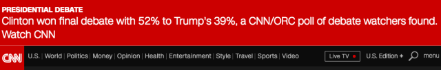 虽然特朗普在最后一次辩论中祭出了自己的上佳表现,但正如上文所说,希拉里同样有着超乎寻常的表现。CNN在辩论后的民调显示,52%的观众认为希拉里获胜,而只有39%的观众认为特朗普表现更好。