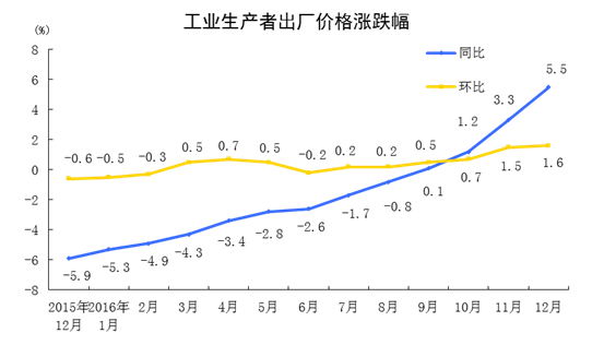 全年PPI同比降1.4%,工业生产者购进价格同比下降2.0%。2016年12月CPI同比2.1%,预期2.2%,前值2.3%。中国2016年12月PPI同比5.5%,为2011年9月以来新高,预期4.6%,前值3.3%。(国家统计局网站)