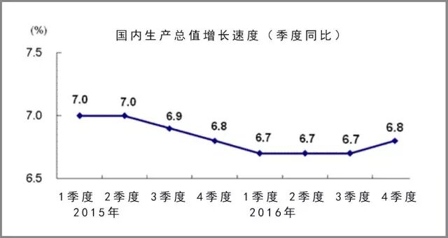 财联社20日讯,2016年我国GDP增速为6.7%,为1990年以来最弱水平,全年国内生产总值为744127亿元。第一、二、三、四季度GDP分别同比增长6.7%、6.7%、6.7%和6.8%。
