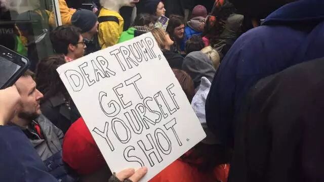 △ 反对者人群中有人举着诅咒新任总统的标语:亲爱的特朗普,中枪吧