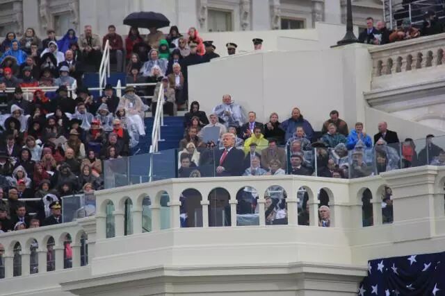 我所在的位置是在国会大厦前的斜右侧靠前,属于绿色区,区内有安排座椅,民众大多是向州内国会议员发请求得到的观礼票,也有不少是共和党捐赠者的亲友,基本上是铁杆共和党人。而这个区域后的橙色区域,是无座区,区内不少人都是清晨6点观礼区一开门就进场占座的铁粉。