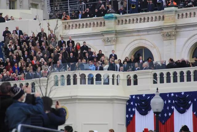 特朗普进场后,大家都在期待着他的就职演讲。牧师祷告和表演时,民众还认真听着,但当民主党参院领袖舒默演讲时,从橙色区传来一波波的声浪:“特朗普总统,特朗普总统”, “USA, USA”,甚至还有特朗普竞选时的经典口号“抽干沼泽”。