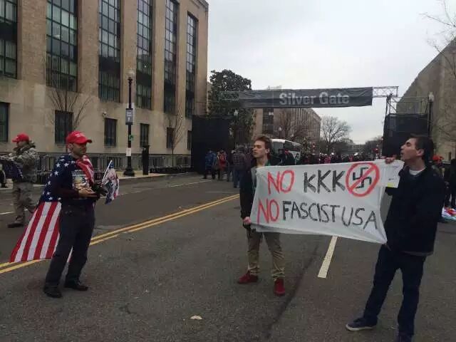 △ 华盛顿街道上的特朗普反对者,横幅上写着:不要3K党,不要法西斯