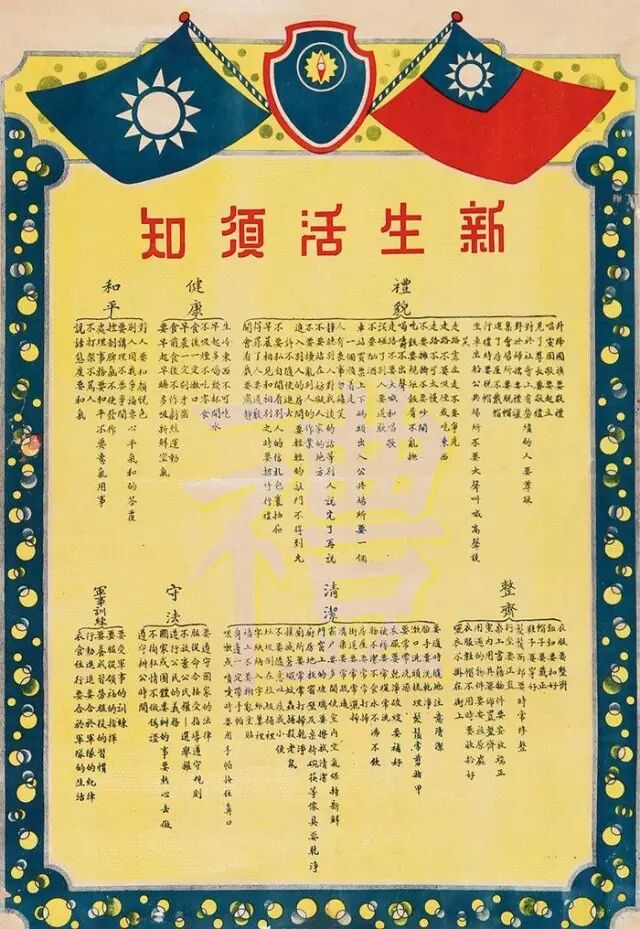 “礼义廉耻”出自管仲《牧民篇》。一九三四年蒋介石在南昌发起大规模的“新生活运动”,把“礼义廉耻”当作全民道德教育的核心主轴,希望把这一套修身哲学贯彻到政府官僚系统、社会生活层面,尤其是学校教育体制里面去。延续到后来的台湾,“礼义廉耻”的“四维”成为所有学校的基本校训,代代相传。街道名称是忠孝仁爱信义和平的“八德”。《青年守则十二条》,像基督教的主祷文一样,每周的周会里全校师生跟着合声背诵。