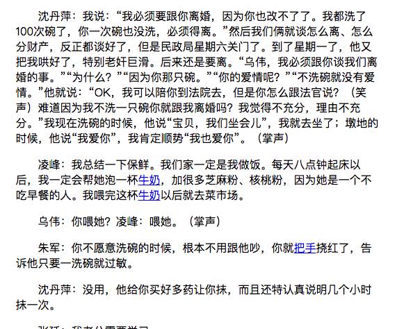 请注意,朱军老师在对待沈丹萍和乌伟这对夫妇的“洗碗”问题时,提出的解决方案是,“把手挠红了,告诉他只要一洗碗就过敏”。也就是说,如果女人有不能洗碗的生理疾病,那么,洗碗是可以避免的。
