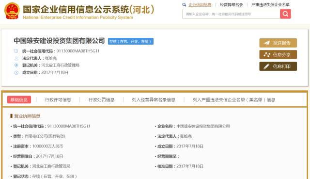 8月7日消息,“中国雄安建设投资集团有限公司”在今年7月18日正式成立。公司是经河北省政府批准成立,具有独立法人资格、自主经营、独立核算的国有独资公司,初期注册资本100亿元人民币。