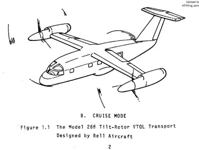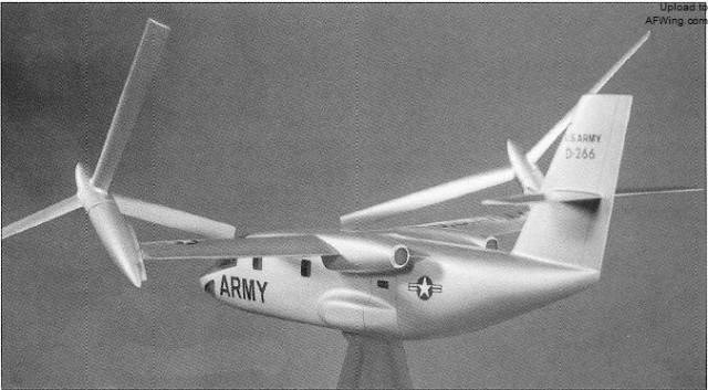 贝尔直升机公司是研制倾转旋翼机的急先锋。该公司在上世纪50年代中期先是研制了一种原始的倾转旋翼机XV-3,并一直试飞到20世纪60年代中期。随后贝尔应美国陆军的轻型战术运输机需求,以XV-3的研究成果为基础推出了一种实用化的倾转旋翼机方案——Model 266,该机将安装两台通用电气公司(GE)的T64涡桨发动机,可载员30名。