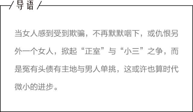 如今,在某热门事件中,张爱玲的虚构变成了现实。当女人感到受到欺骗,不再默默咽下,或仇恨另外一个女人,掀起“正室”与“小三”之争,而是冤有头债有主地与男人单挑,这或许也算时代微小的进步。围观群众虽然各有各的立场,但总算不再一股脑儿地骂“小三”,而是从具体细节上判断是非曲直,也与往日不同。