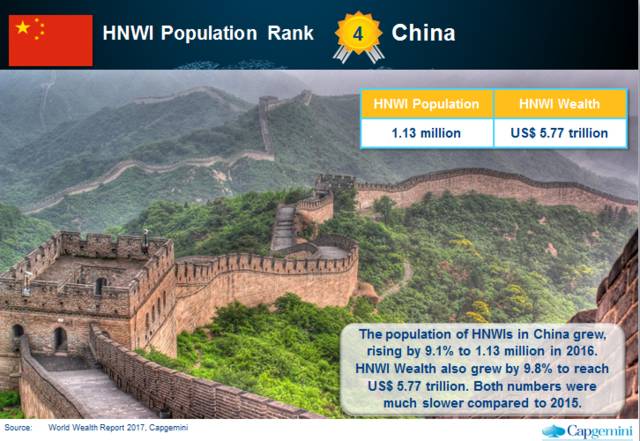 其中,美国富豪人数约为480万,财富总值达到16.83万亿美元;日本富豪人数约289万人;德国128万人;中国排在第四,约为113万人,财富总值达到5.77万亿美元。(凤凰财经)