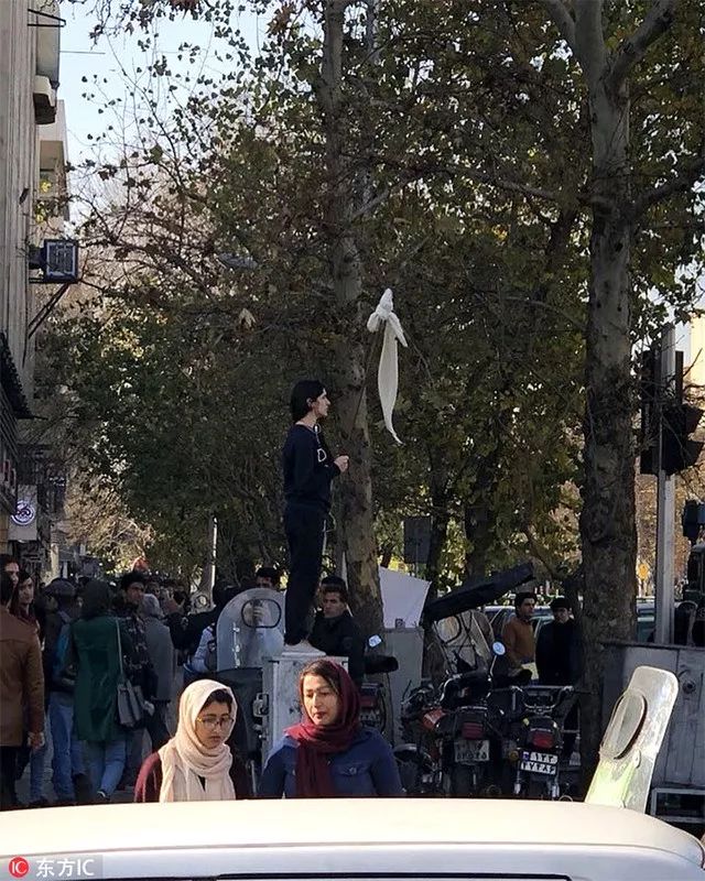 12月28日。一个伊朗女孩站上高处,在人来人往的街道上,高高挑起白色头巾,没有遮盖的头发随风轻扬。在所有成年女性出门必须包裹头发的伊朗,这无异是极大的挑衅。
