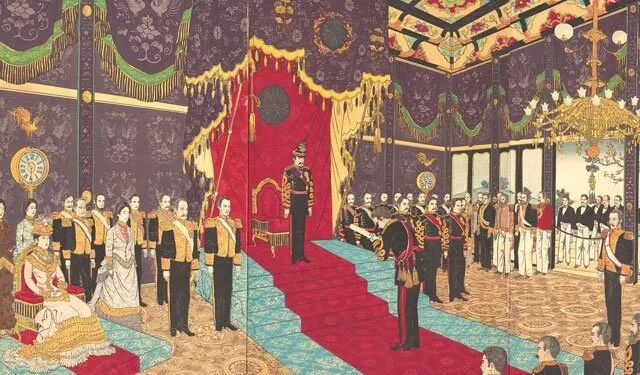 最终,“德学派”的主张被采纳和贯彻,1889年2月11日,即“神武天皇即位日”,首先由明治天皇宣读“上谕”,然后亲手将《大日本帝国宪法》(通称《明治宪法》)交给首相黑田清隆。这一仪式本身即显示了“钦定宪法”的性质。