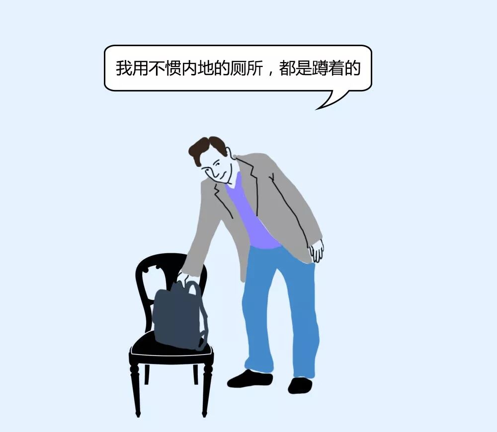我就问,什么意思?他说:“大陆厕所都是蹲着的,我不习惯。”当时没人接茬,也许大家都不知道该说些什么,场面又一度沉默了。