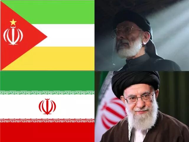 △ 影片中的“扎卡组织”旗帜(左上)与伊朗国旗、“扎卡组织”头目(右上)与伊朗最高领导人哈梅内伊 来源:作者