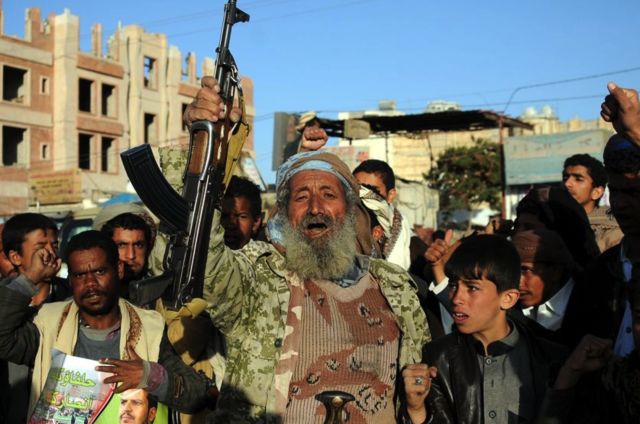 △ 2017年12月5日,胡塞武装支持者举行集会,庆祝也门前总统萨利赫被杀  来源:视觉中国