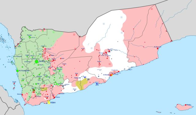 △ 也门形势图,绿色为胡塞武装,红色为哈迪政府,白色为“基地”,黄色为“南方运动” 来源:Ali Zifan