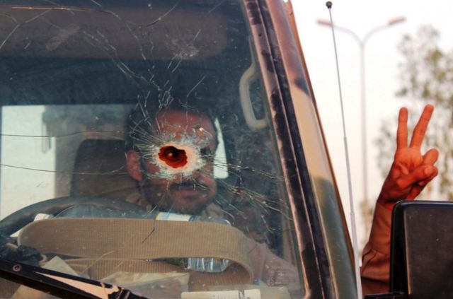△ 也门马里卜,一名士兵从被子弹射穿玻璃的车里伸手摆出V字 来源:Angus McDowall/CFP