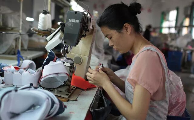 2015年4月20日,福建莆田,缝纫车间的制鞋女工。(图片来源:视觉中国)