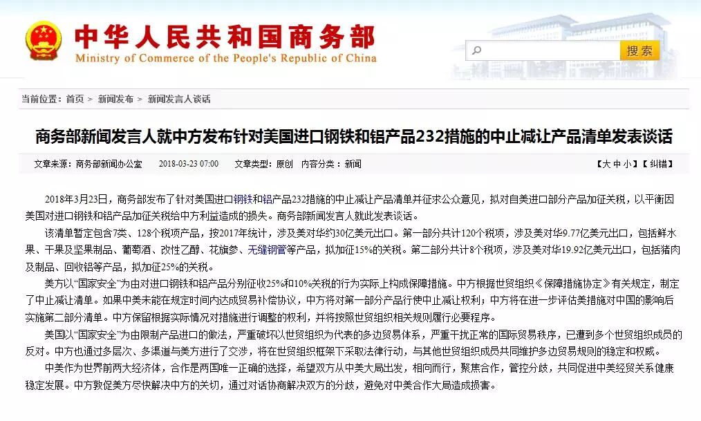 23日,中国商务部发布针对美国进口钢铁和铝产品232措施的中止减让产品清单并征求公众意见,拟对自美进口部分产品加征关税,以平衡因美国对进口钢铁和铝产品加征关税给中方利益造成的损失。该清单暂定包含7类、128个税项产品,按2017年统计,涉及美对华约30亿美元出口。