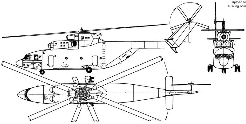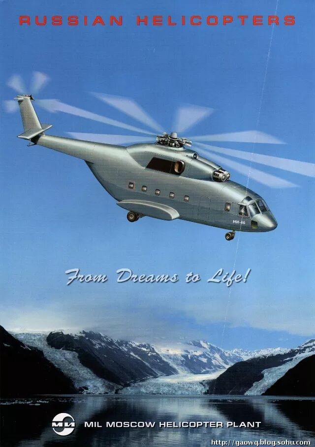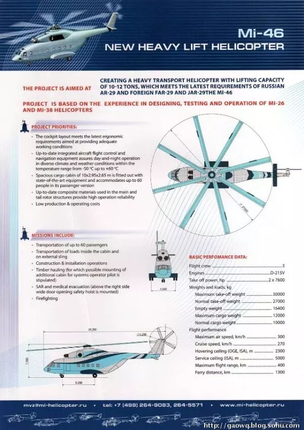 另一方面,为了维持俄罗斯设计和生产重型直升机的能力,米里公司在20多年来一直在研究新一代重型直升机。该公司曾在1992年宣布了米-46方案,以米-26为基础安装27.6米直径的八叶主旋翼和两台航空发动机公司D-215V涡轴发动机,单台发动机功率7600轴马力,体量低于米-26,设计载重10-12吨。